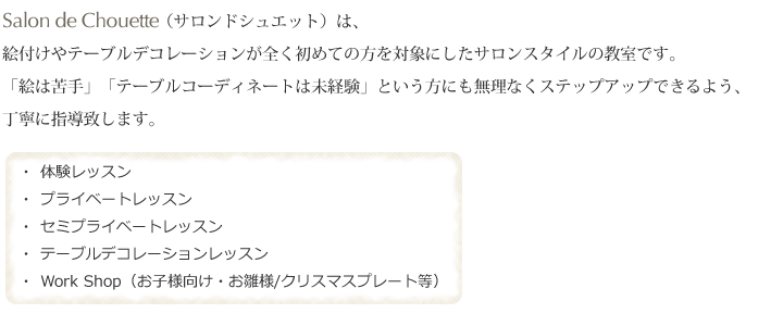 不定期に開講。 Lesson料金 内容 詳細につきましては blogでご紹介いたします。 お問い合わせはこちら