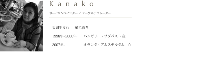 雑誌に掲載されていた「ポーセリンペインティング」の記事に目を奪われたのはもう10数年以上前。絵を描くことに全く縁がなかった私の生活ですが、自分で描いた作品が増えていくことに喜びを感じました。柄・色の組み合わせ、レイアウト次第で世界にただ一つの作品が出来上がります。オリジナルの食器&季節のテーブルデコレーションは、私の何気ない毎日をより楽しく演出してくれます。お気に入りのカップ&ソーサーを使ってのティータイムは、私にとって欠かせない大切なひと時です。